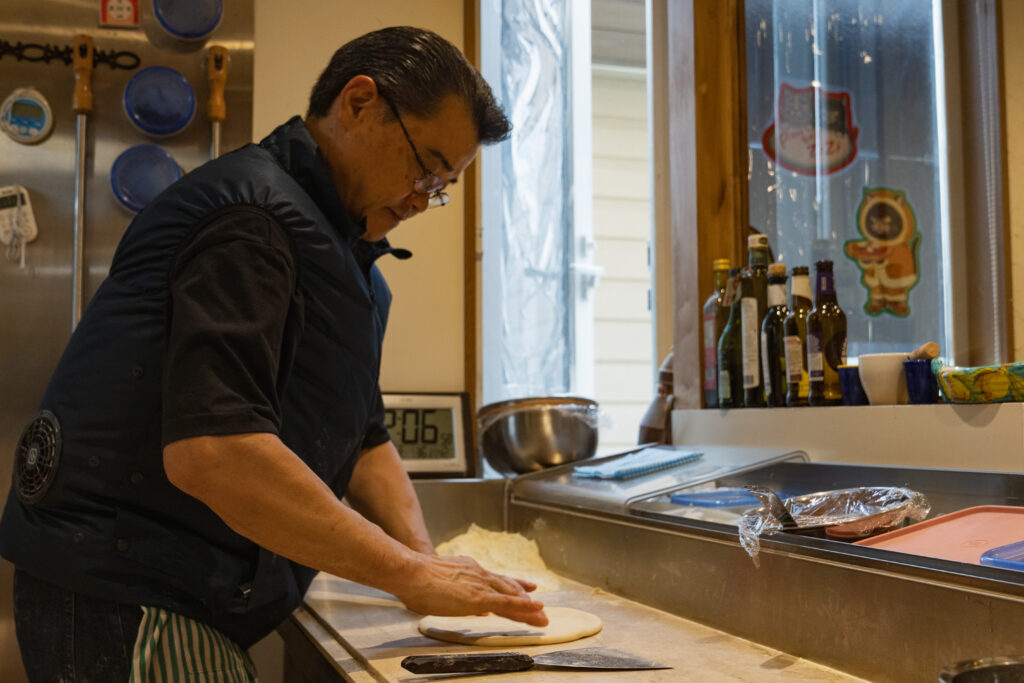 「2005年に富良野チーズ⼯房でモッツァレラチーズの製造が決まり、モッツアレラチーズの研修のため3週間イタリアへ行きました。研修先のチーズを使用しているピッツェリアへ行き、そこで⾒たPizza職⼈たちの、柔らかい⽣地を数⼿で伸ばす技術や、アクロバティックに⽣地を回すパフォーマンスには度肝を抜かれました。遠⼼⼒を利⽤し、⽣地にダメージを与えず早く伸ばすその技術は、まさに理にかなったものでした。」