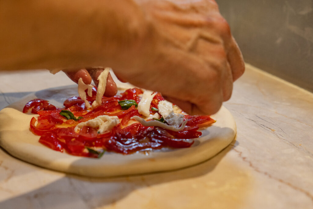 トッピングの野菜は基本的にふらの産で、その野菜が⼀番輝く調理法や表現⽅法を何度も試⾏錯誤します。⼀⽅で、現地ナポリと同じ味を表現するために必要な食材はイタリア産にこだわっています。協会認定店として、伝統的な⼿法・技術でナポリと同じクオリティのナポリPizzaを提供する使命があるからです。」